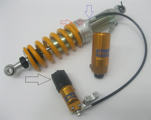 (Shown above Right) Ohlins BM303 shock with New Style Remote preloader does more range than the Ohlins older traditional preloader.